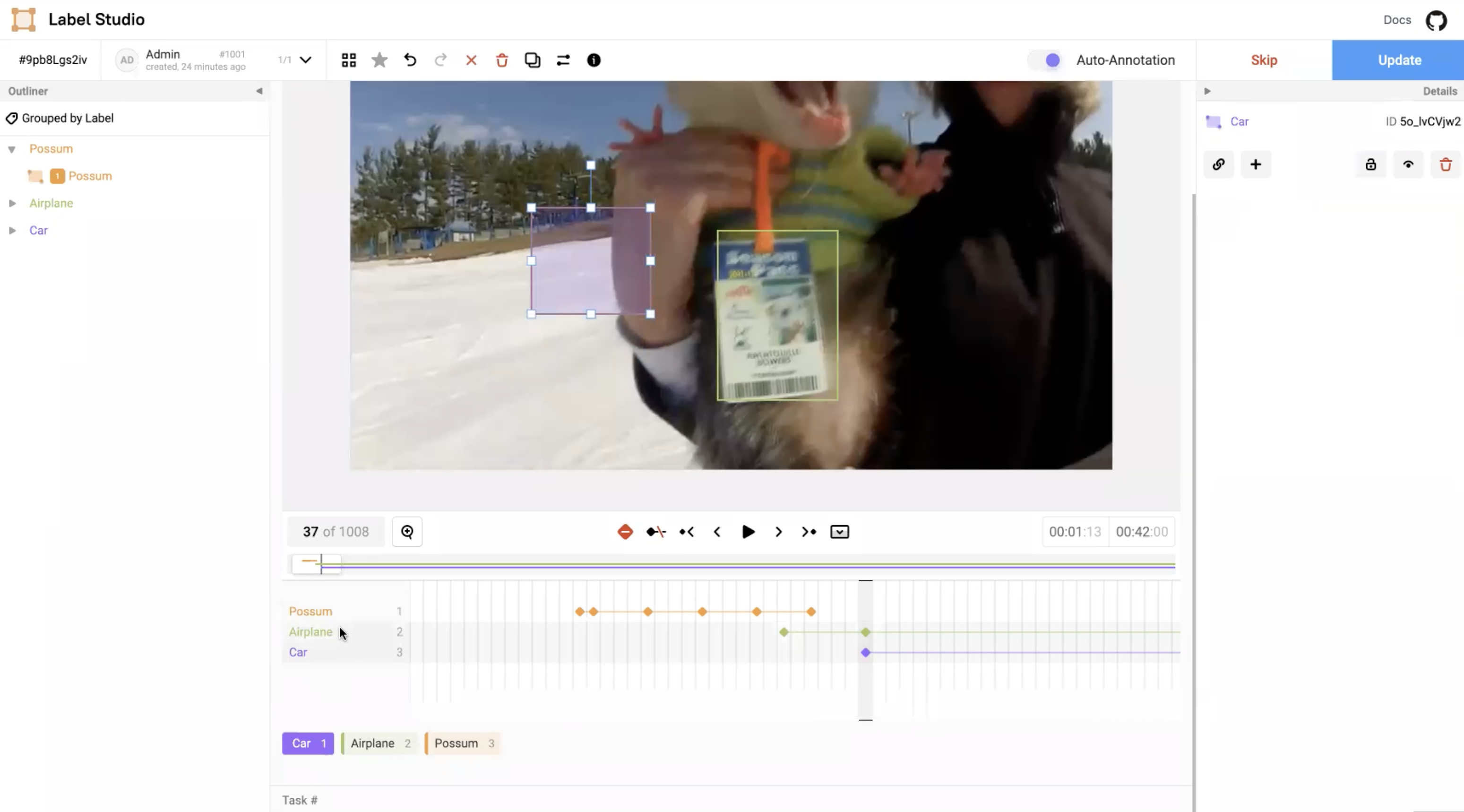 When you work with timestamps or timelines, you can add a keyframe on the bounding box and start at a particular frame number. A thin line (goes to the end of the video while scrolling) represents the transition or lifespan of the bounding box. You can track a badge using one frame after another.